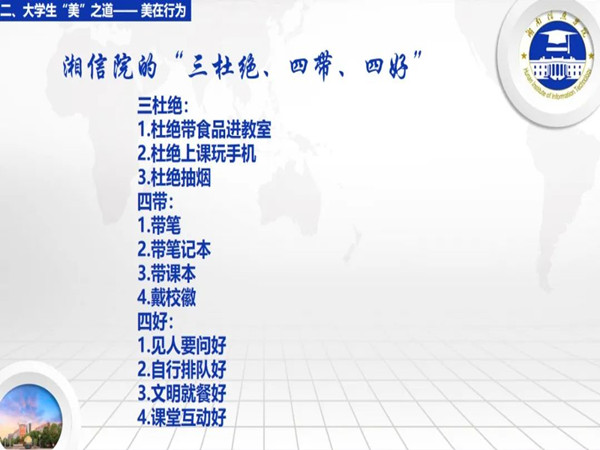 希望同学们通过这次讲座的学习,以点带面,在全校范围内营造起在生活中多一双去发现“美”的眼睛,树立正确的审美观,培养感知能力,提升自我创造能力,陶冶情操,提升文化修养,在学习中勇进取,攀高峰的良好氛围,展现出我们湘信青年的良好精神面貌,向美而行,以美润心!(文/周曼曼 图/余婉芊 一审/艾艳红 二审/邓宗林 三审/付启军)